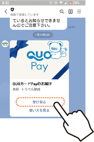 LINEメッセージでQUOカードPayが届きます。「受け取る」を押します。