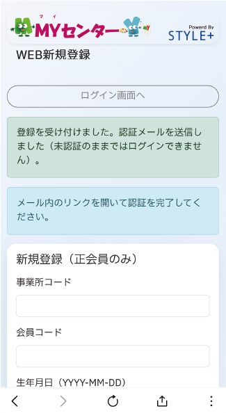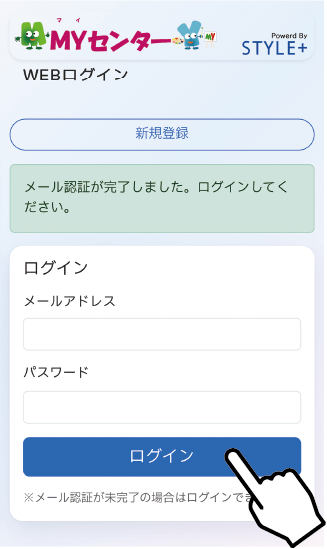 メール認証完了画面となりますので、登録したログイン情報を入力してログインしてください。