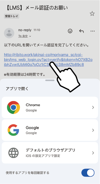 届いたメールのリンクをクリックします。ブラウザの選択画面が表示された場合は、普段使用しているブラウザの選択をしてください。